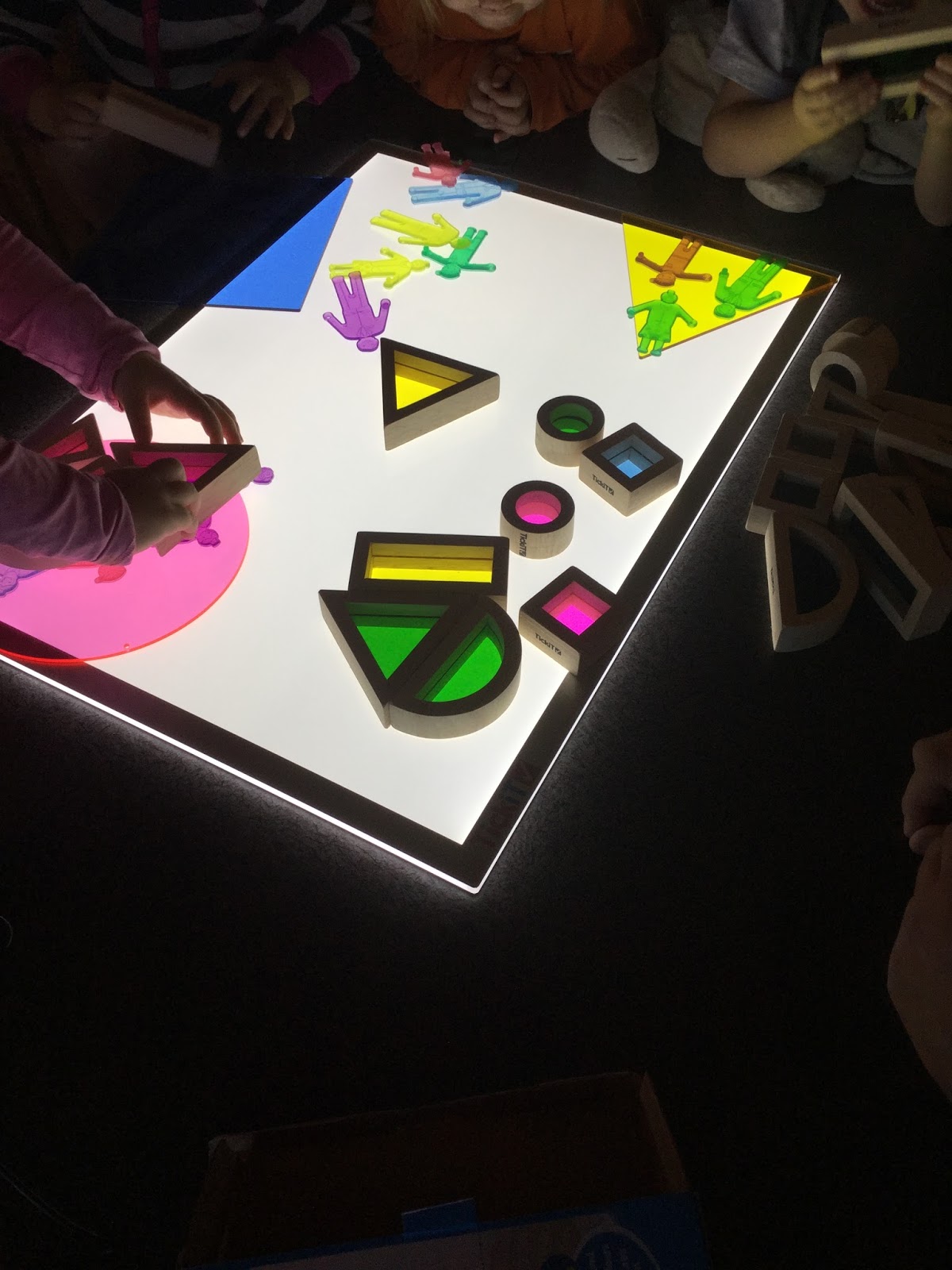 Idag har vi börjat bekanta oss med ett ljusbord och tillhörande material. Barnen fick tillsammans prova att lägga olika figurer och former i olika färger på bordet för att se hur de ser ut när de är upplysta.
